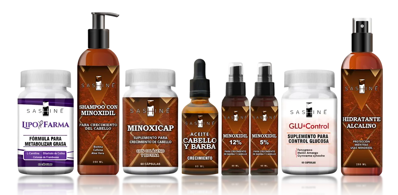 En Sashiné nos especializamos en crear productos de alta calidad para el cuidado integral de tu salud y bienestar. Además de soluciones para el crecimiento y cuidado de tu cabello y barba, como fórmulas con minoxidil, también ofrecemos productos que apoyan tu bienestar general. Entre ellos se encuentran Glu Control, diseñado para que personas diabéticas recuperen el equilibrio natural de su glucosa, y Lipo Farma, tu aliado natural para quemar grasa y reducir tallas, brindándote una solución completa para lucir y sentirte mejor, tanto por fuera como por dentro.